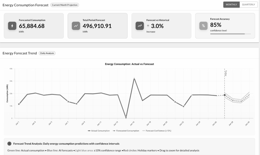 - Energy Forecasting: Using historical patterns, weather, occupancy schedules and other inputs to predict hourly or daily consumption. Advanced models significantly outperform basic regressions in accuracy.These predictions help facility teams plan load shifts and demand response strategies in advance.